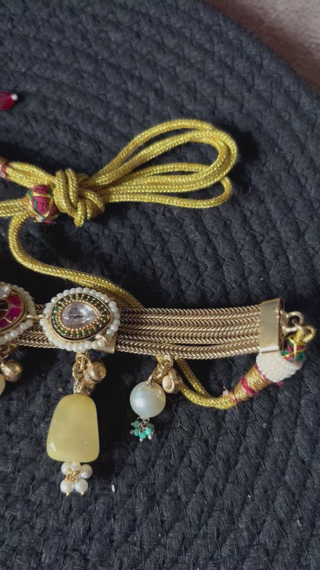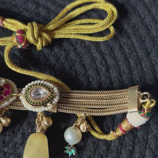 Delicate bead drops in soft pastel hues, pearls, and natural-toned stones add graceful movement and dimension, creating a perfect balance between bold elegance and feminine charm. The adjustable dori closure with decorative tassels ensures a secure and comfortable fit.