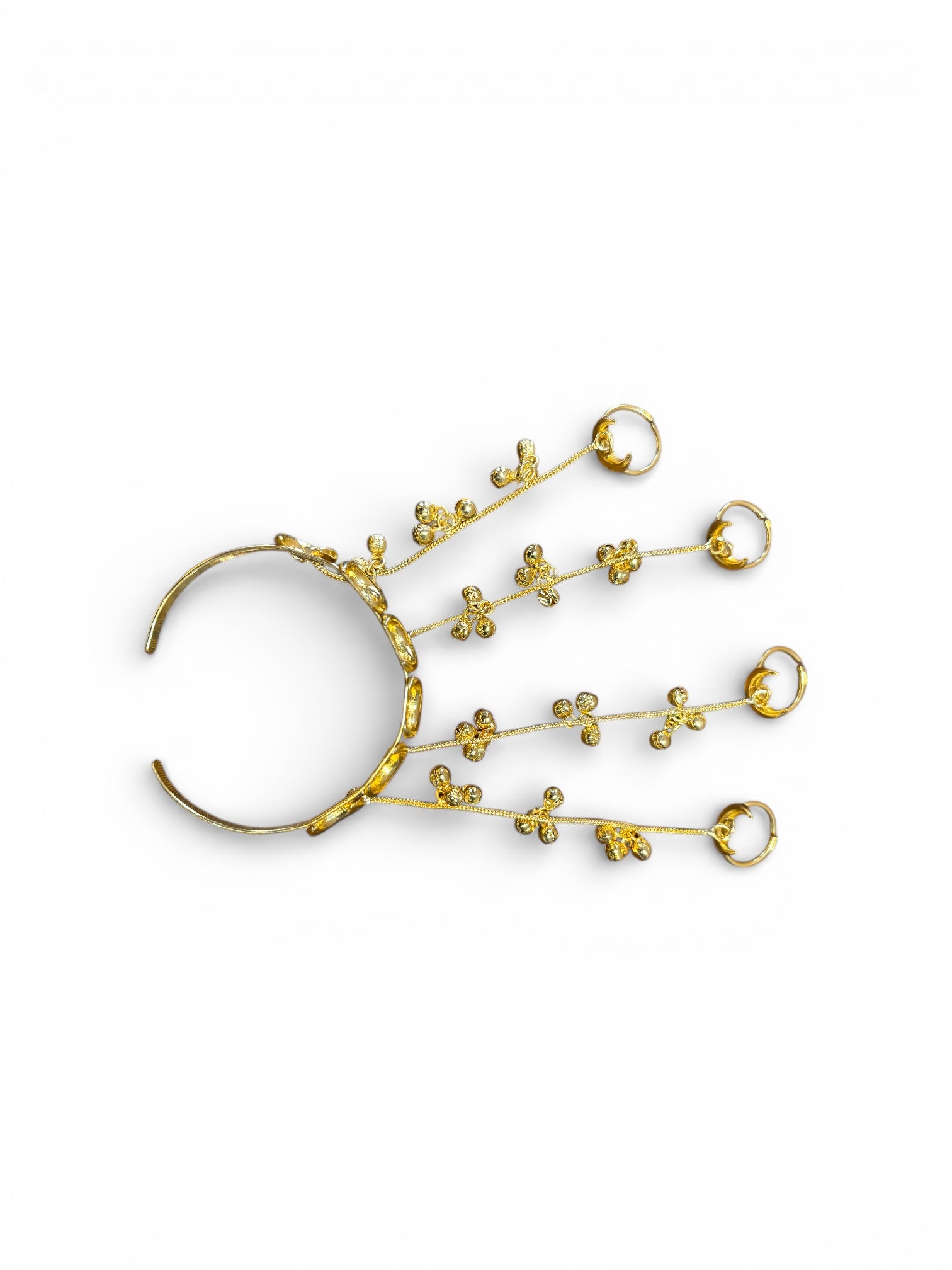 Delicate brass chains connect the bracelet to multiple finger rings, each adorned with charming ghungroo clusters that add subtle movement and a festive appeal. The rich gold-toned finish enhances its regal look, making it a perfect accessory for weddings, festive occasions, and traditional celebrations.