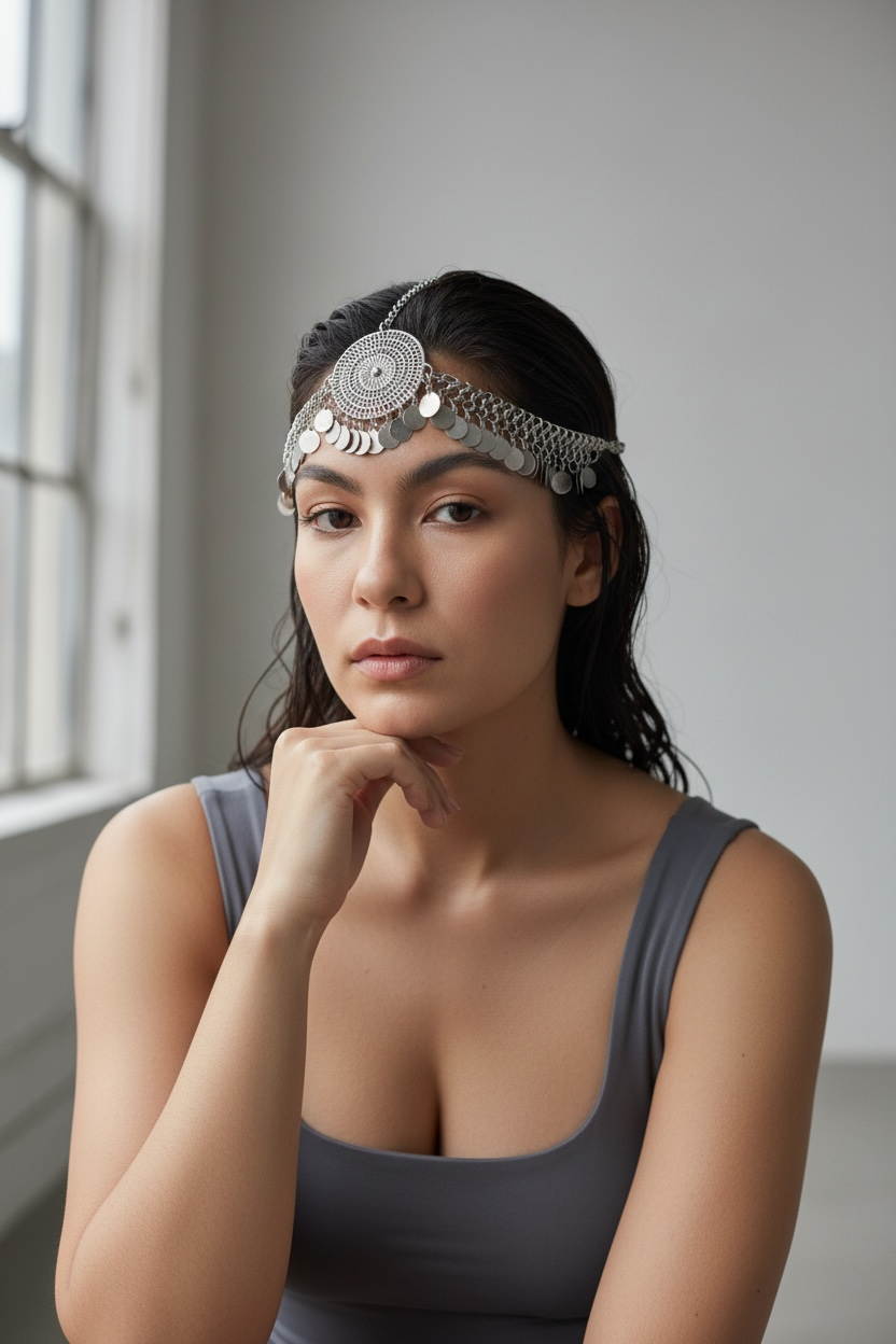The Chandrika Tribal Silver Headgear is a striking statement accessory inspired by traditional nomadic and tribal jewelry aesthetics. Crafted in oxidised silver finish, this headpiece features an intricately carved circular medallion at the center — symbolizing unity and timeless strength.