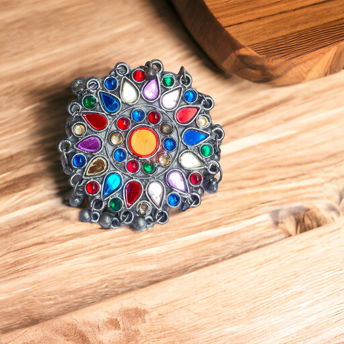a striking Black Polish Ring featuring vibrant multicolored mirror work. This elegant piece combines the rich depth of black polish with the bright, colorful reflections of the mirror work, creating a dynamic and eye-catching design. The multicolored mirrors add a touch of glamour and sophistication, making Anaya a standout accessory for any occasion.