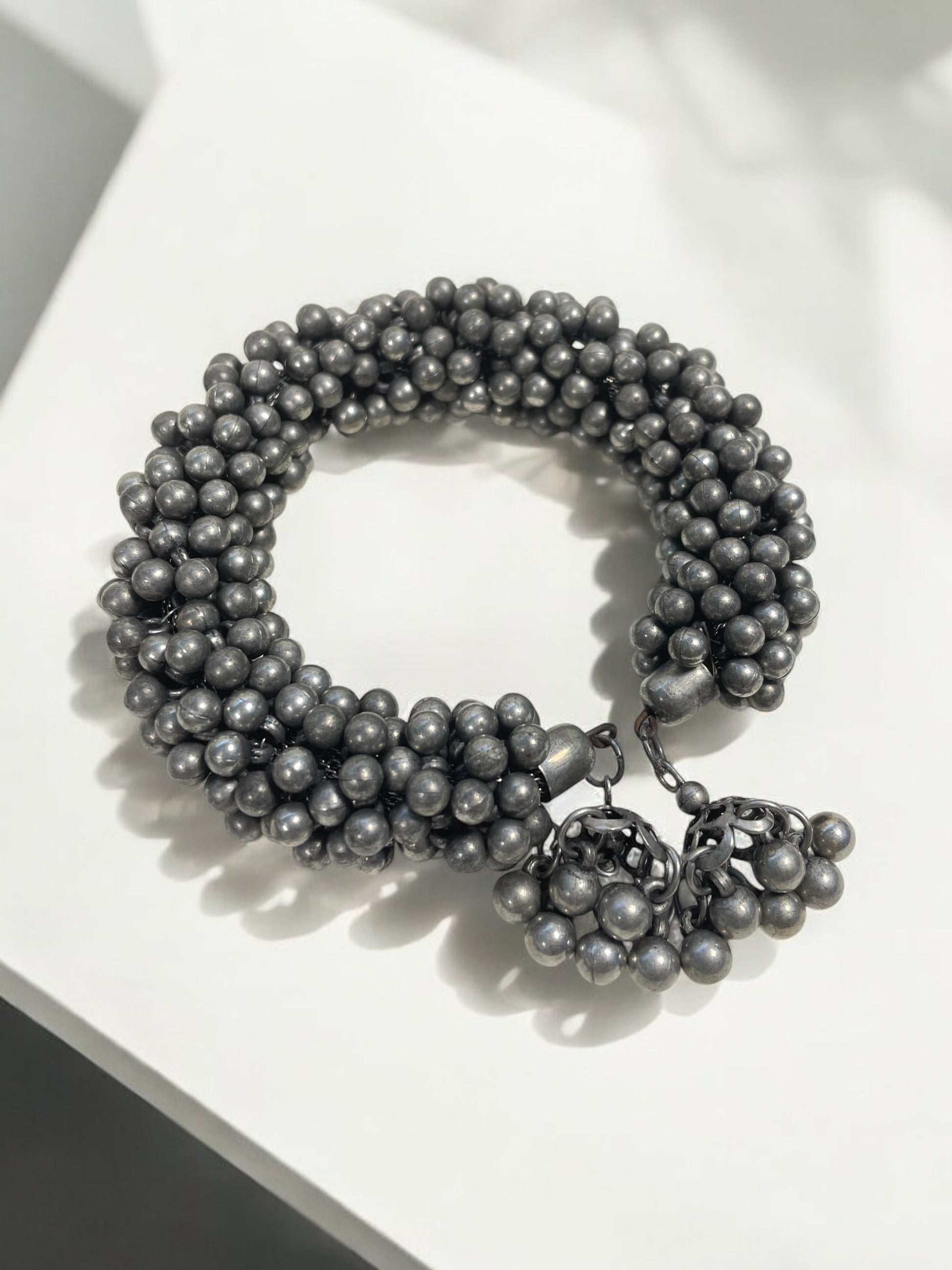 Introducing the **Mogra Bracelet**, a captivating piece designed in black polish that features a full array of black polish beads. This bracelet exudes a chic and contemporary vibe, making it a perfect accessory for both casual and formal occasions. The rich black polish finish enhances its elegance, while the beads add texture and depth to the design. Wear the Mogra Bracelet alone for a subtle statement or stack it with other bracelets for a trendy layered look.