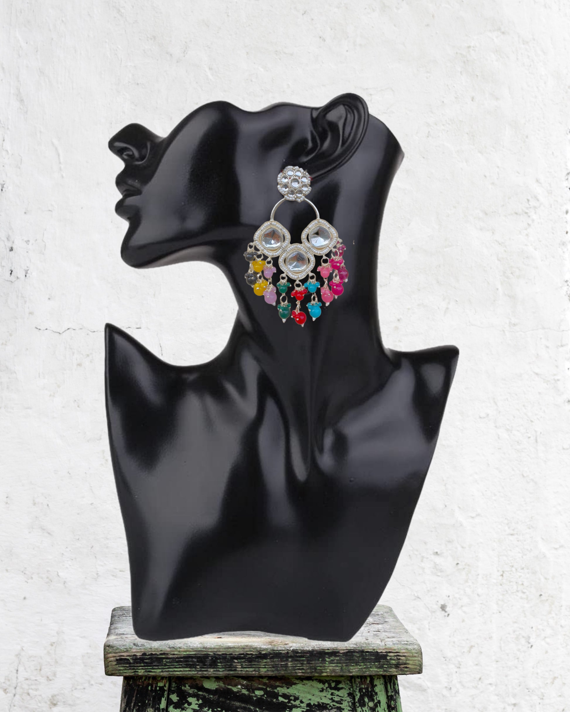 This stunning pair of Kundan earrings features a captivating blend of Kundan and white beads, providing an elegant touch to any ensemble. Additionally, the availability of multicolored beads adds versatility and charm, making them a truly remarkable accessory choice.