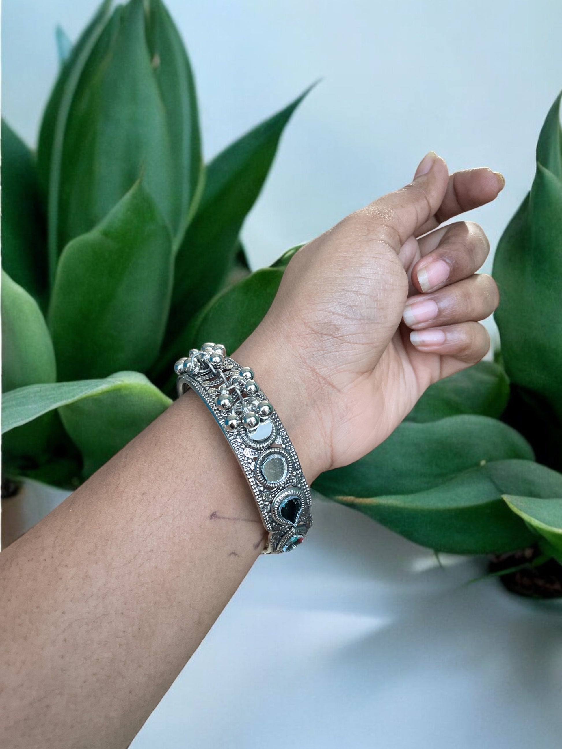 Introducing the **Puja Bracelet**, a stunning piece that beautifully combines mirror work with traditional ghungroo accents. This bracelet showcases an intricate design featuring reflective mirrors that catch the light and add a dazzling effect, while the ghungroo work brings a delightful sound with every movement. Crafted with care, the Puja Bracelet is perfect for festive occasions and celebrations, adding a touch of elegance and cultural charm to your ensemble. Wear it alone or pair it with other jewelry for a complete look.