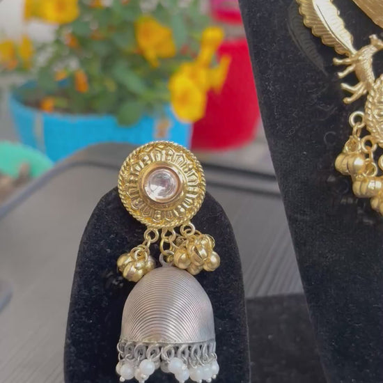The statement pendant flows into graceful matte silver-tone jhumka drops, adding contrast and depth, while the matching earrings mirror the same rich detailing for a perfectly balanced look. Ideal for weddings, festive occasions, and statement ethnic styling, this set is made for those who appreciate bold tradition with a modern edge.