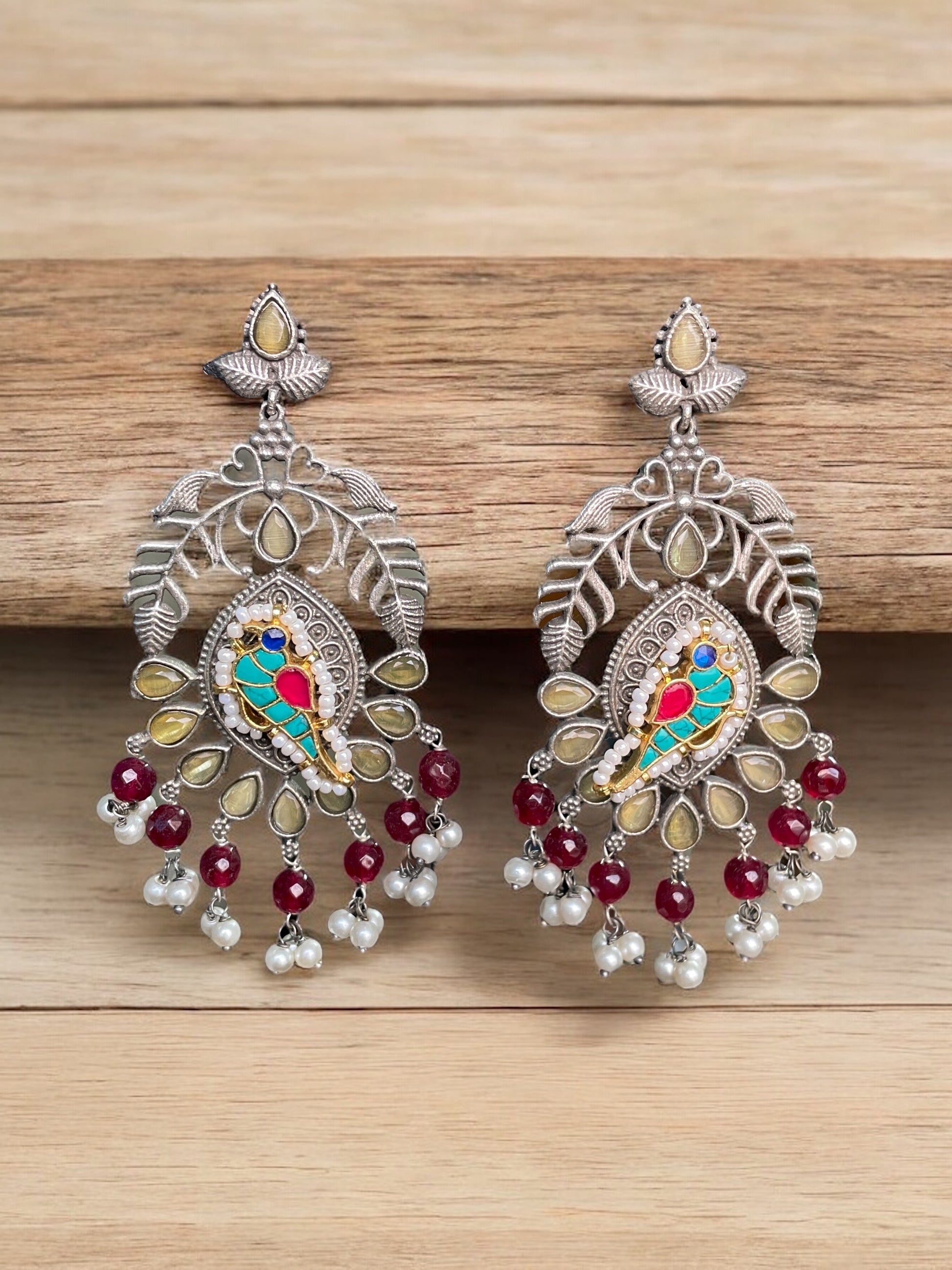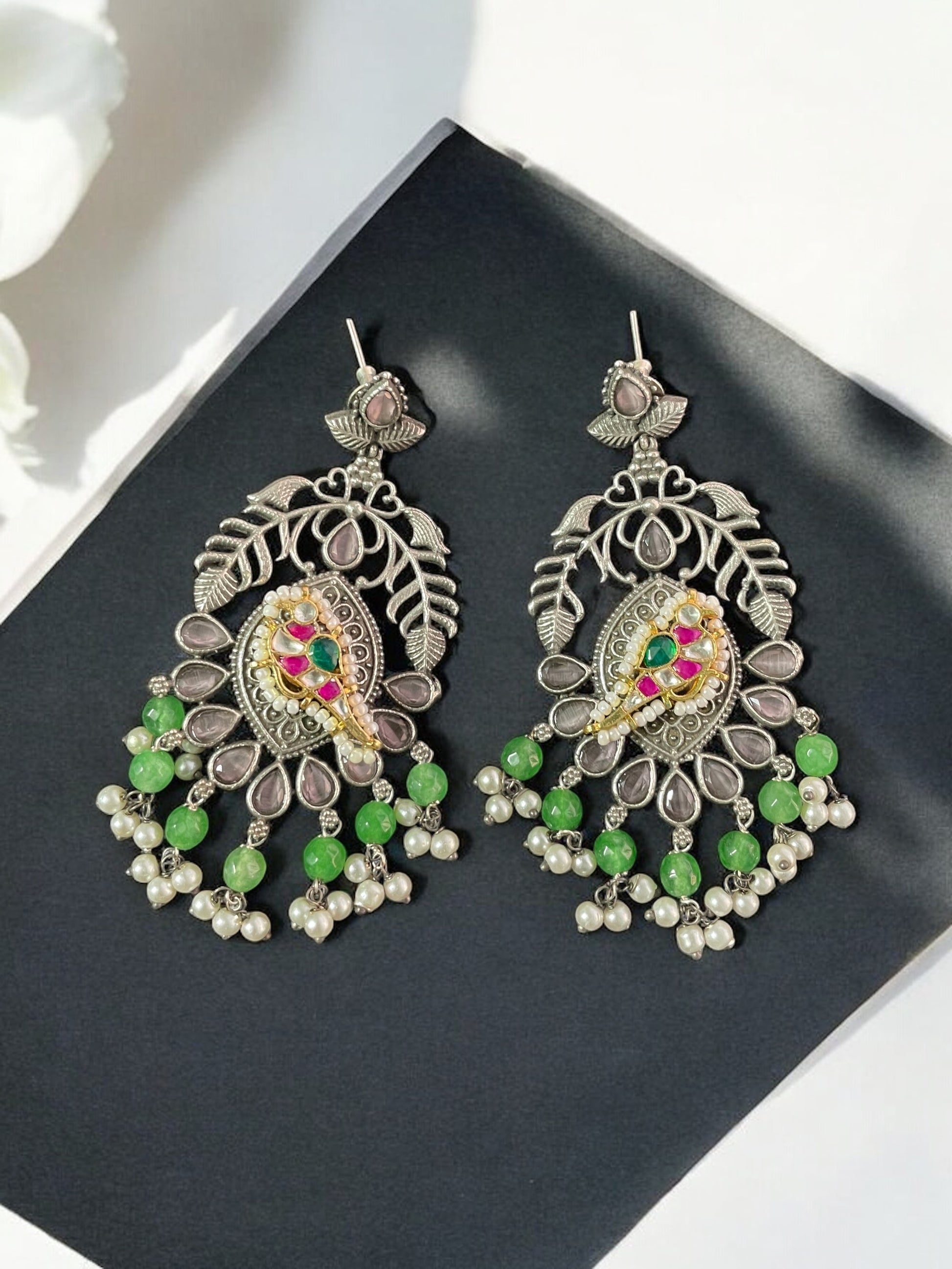 Embrace nature’s beauty with a touch of royalty in the Richa Silver Pacchi Kundan Earrings with Bird Design & Stone Work, a stunning fusion of tradition and creativity.