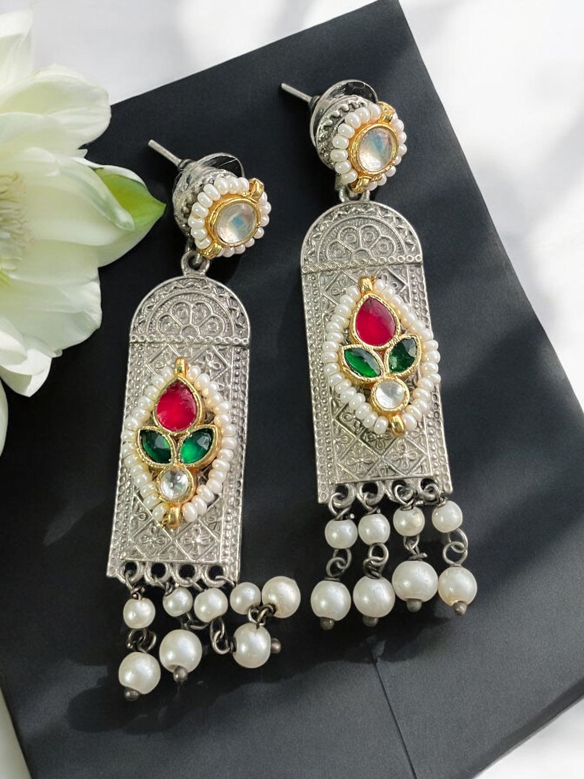Sunita Silver Pacchi Kundan Earrings with Multi-Color Stone Work on Silver Base