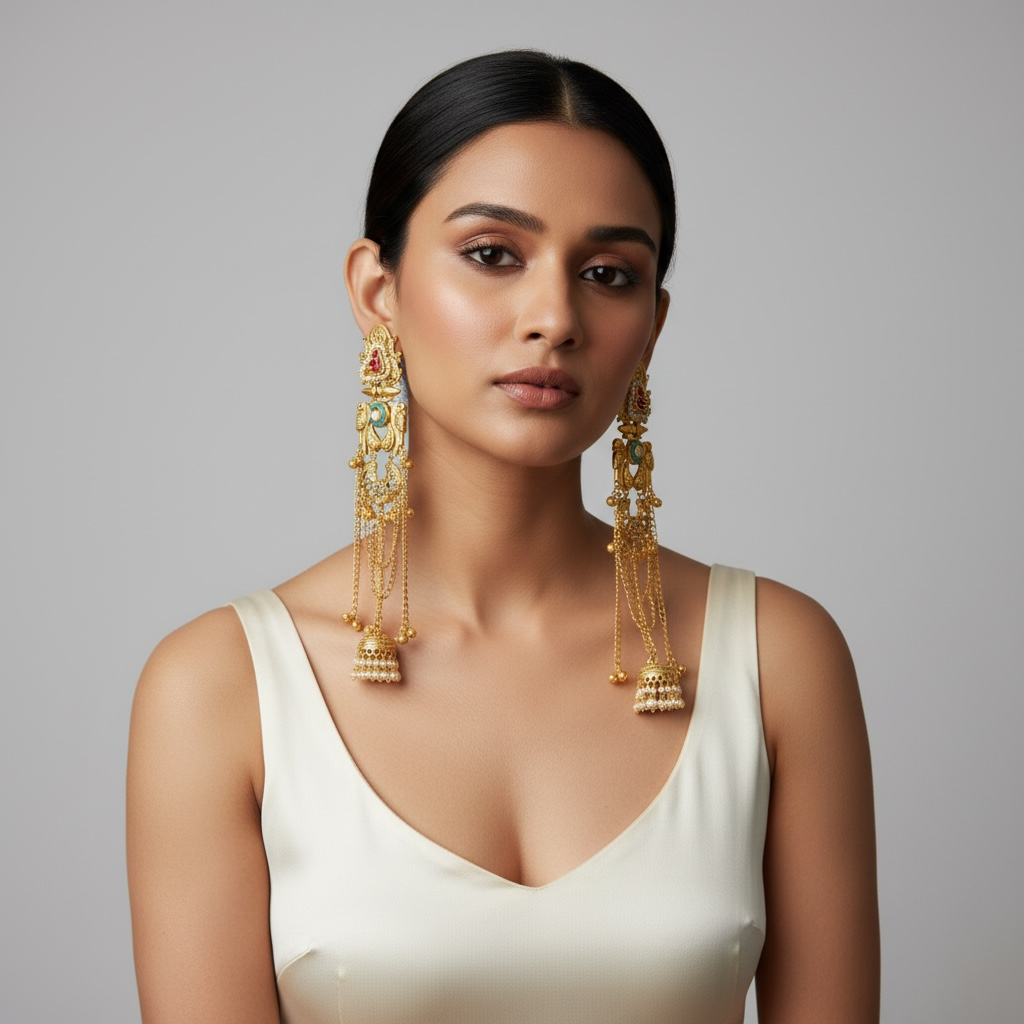 The multi-layered design with cascading chains, ghungroo drops, and pearl-finished jhumkas creates graceful movement and a majestic look. Perfect for brides, festive celebrations, and grand occasions, this pair effortlessly blends tradition with opulence.