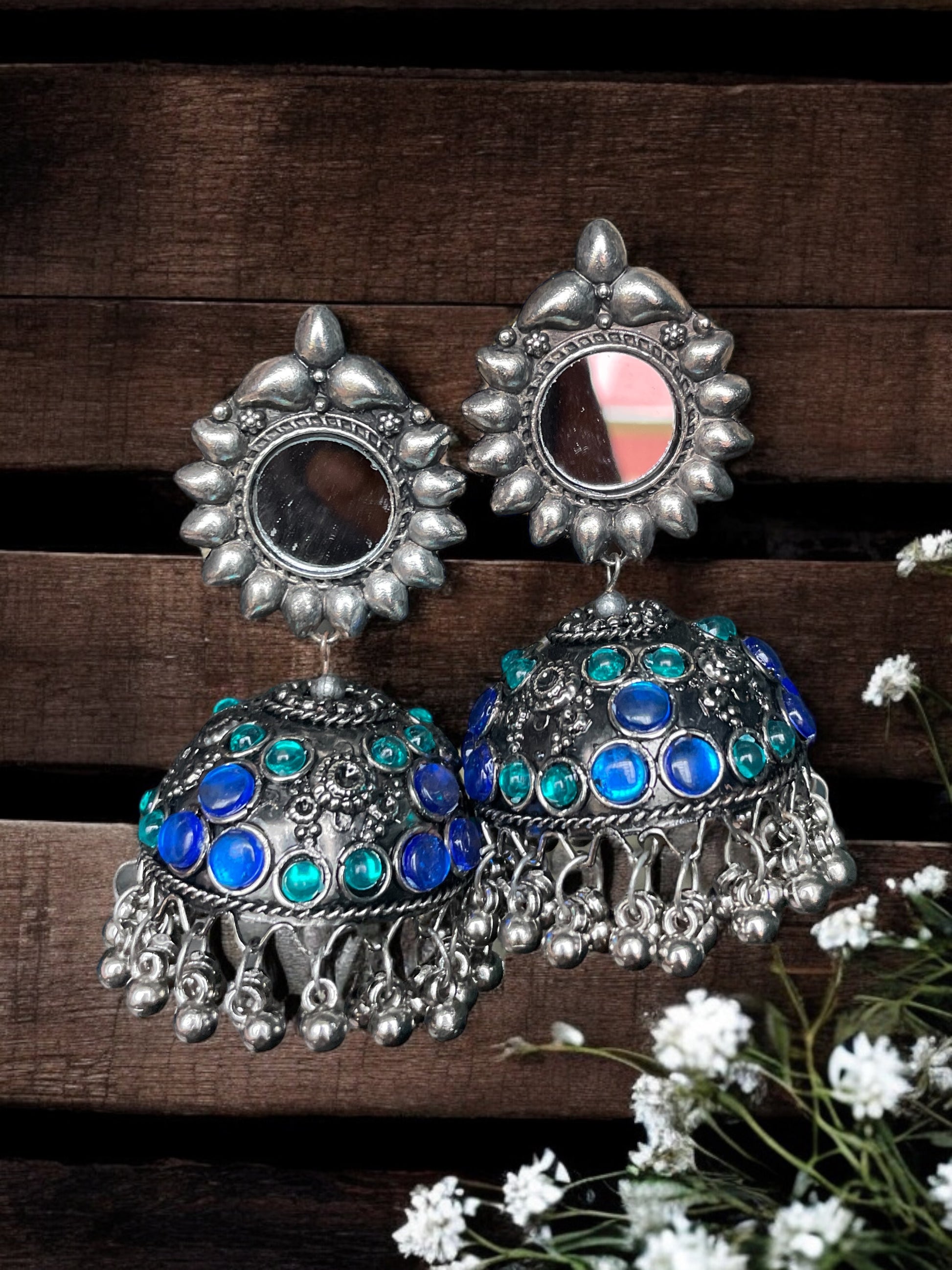 Introducing "Vanya" - a beautiful Black Polish Jhumka featuring multicolored stone work, available in three stunning color variations. This elegant piece showcases dazzling mirror tops and delicate silver hangings, creating a perfect blend of tradition and modernity. Measuring approximately 2.5 inches in both length and width, "Vanya" is designed to make a bold statement while adding a touch of grace to any ensemble. Ideal for festive occasions or elevating your everyday look, this jhumka is a must-have for those who appreciate the art of fine jewelry.