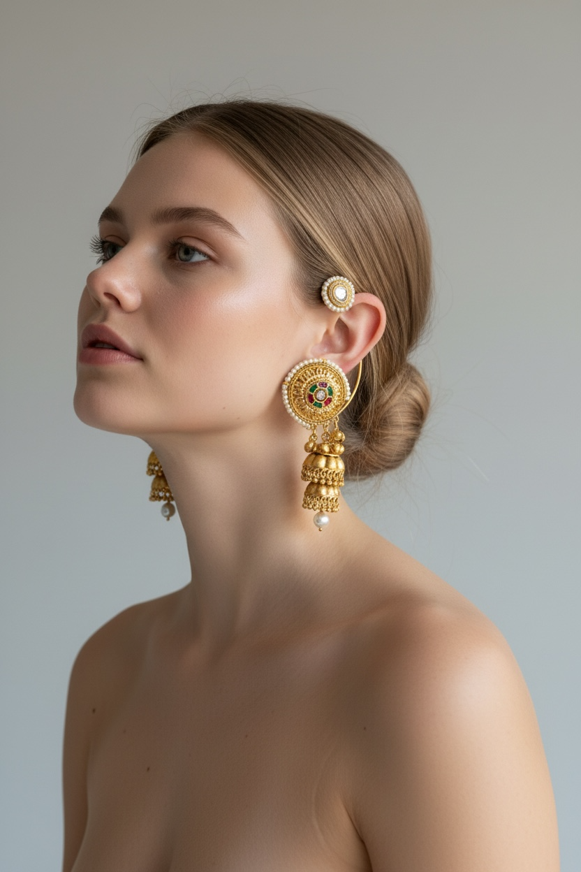 Unlike conventional earrings, this ear uff creates a dramatic silhouette — perfect for brides, festive occasions, and statement ethnic styling.