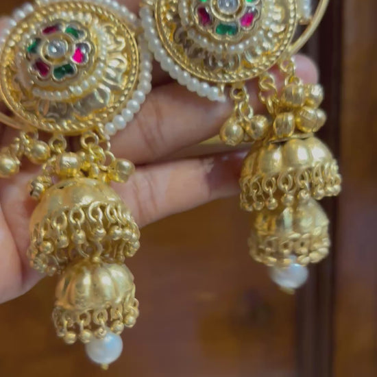 The detailed round motifs are adorned with delicate pearl borders and traditional red-green stone accents at the center, adding a heritage charm. Below, layered antique-finish jhumkas with pearl drops create beautiful movement and a soft rhythmic sway.