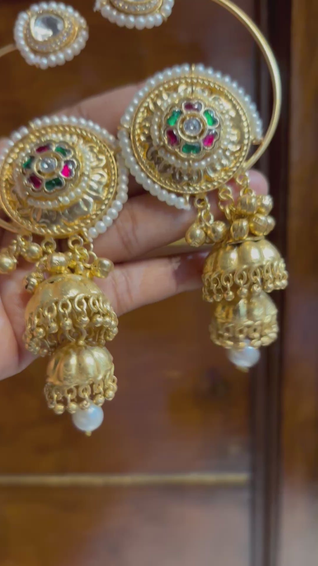 Bold tradition meets contemporary styling in the Varnika Royal Pearl Ear Uff. Designed to frame the ear with regal elegance, this statement piece features a graceful circular gold arc connecting a kundan-style stud to intricately carved temple-inspired medallions.